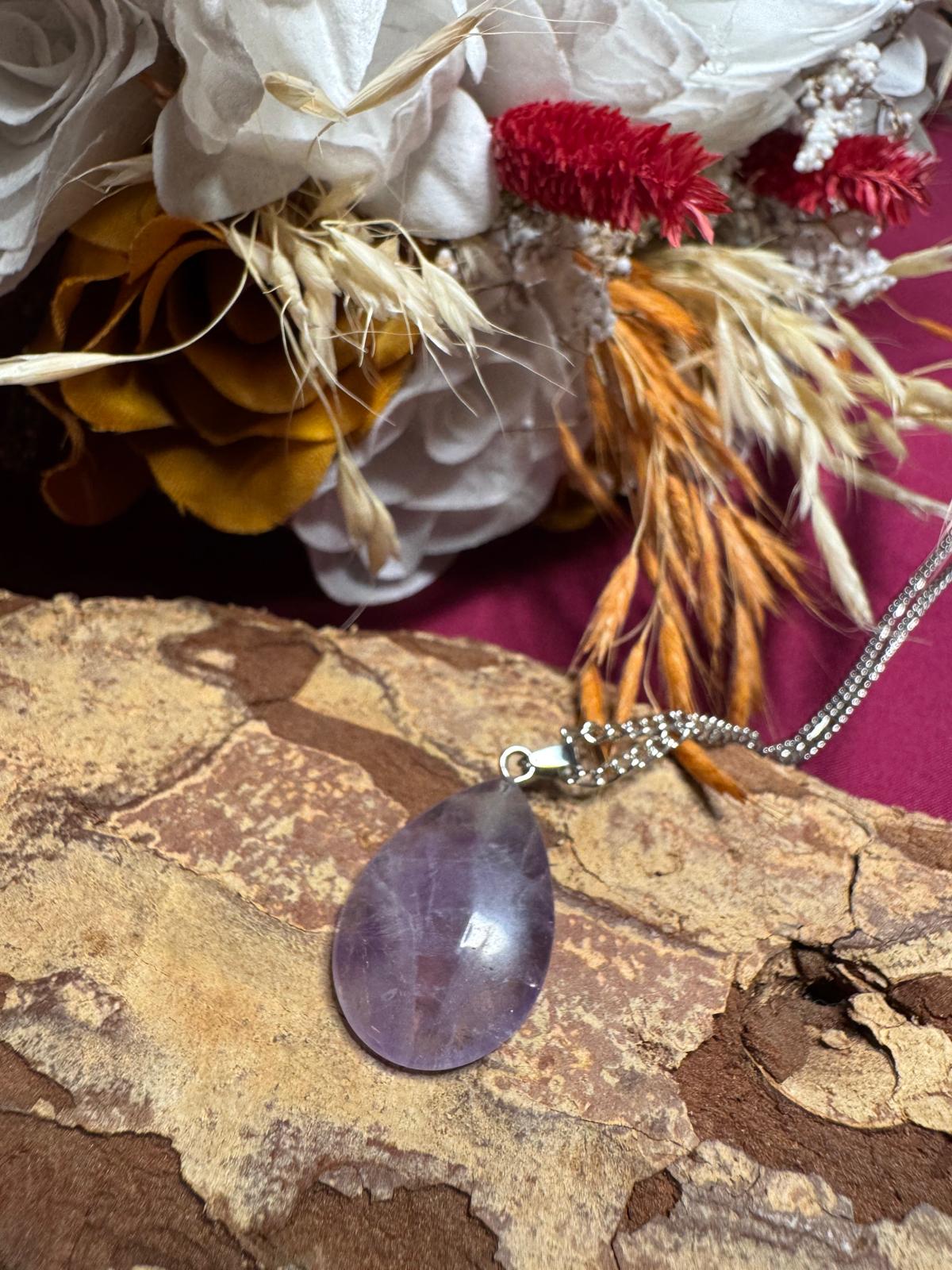 Doğal ametist kolye damla modeli, etrafınızda koruma alanı sağlar. Aynı zamanda düşük enerjili veya “nazar” denilen durumlara karşı da koruyucu bir etkisi vardır.