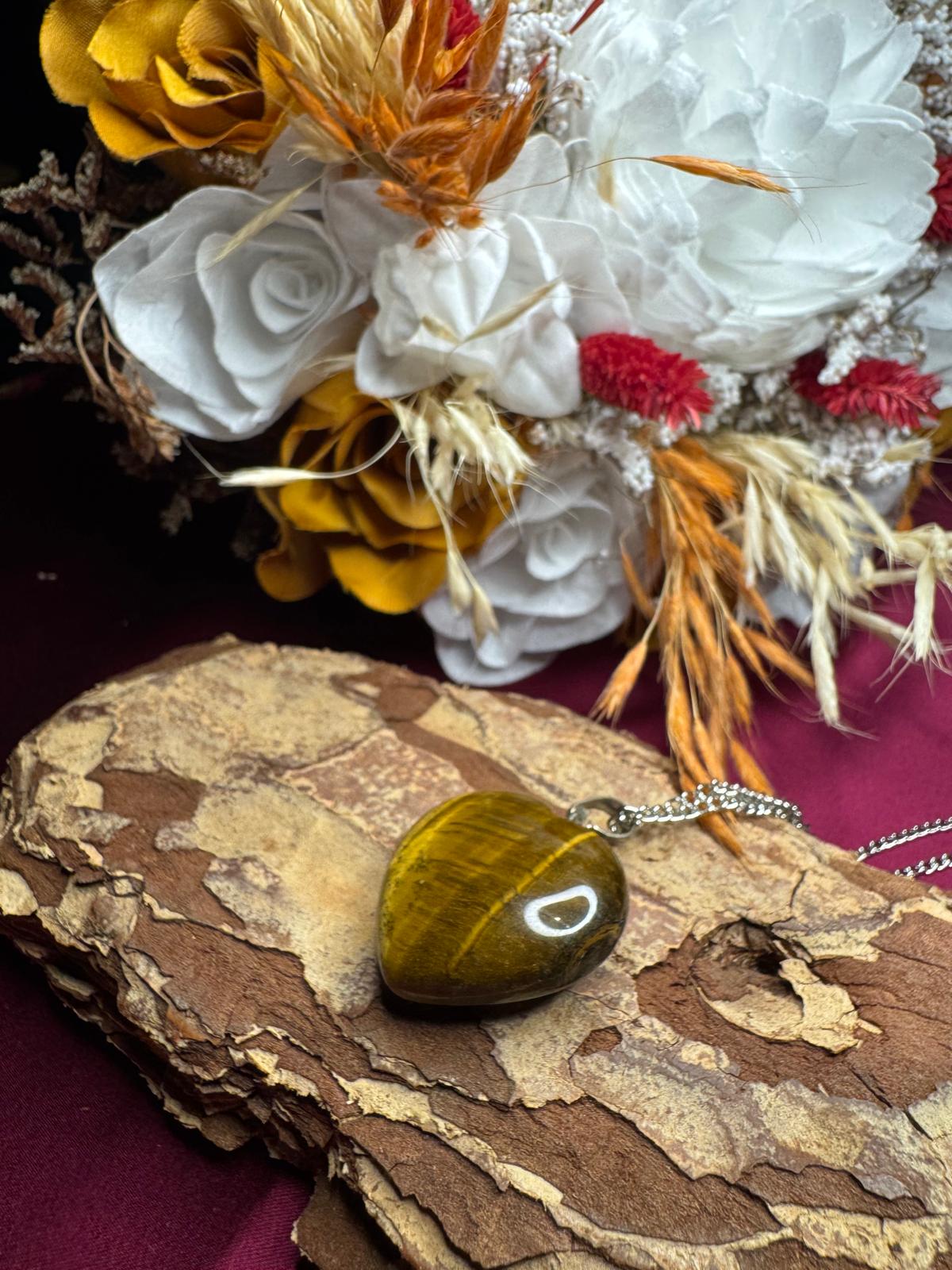 Kaplan gözü kolye kalp modeli, belirgin kahverengi ve turuncu rengi ile karakterize edilen ve çizgili deseniyle dikkat çeken bir kuvars çeşididir. Kaplan gözü kolye, özellikle yüzeyindeki ışıltılı, altın rengi şeritlerle bilinir. Bu eşsiz özelliklerinden dolayı, kaplan gözü, binlerce yıldır inançlara ve mitlere ilham kaynağı olmuştur ve “kaplan gözü” adını bu ışıltılı görünümünden alır.