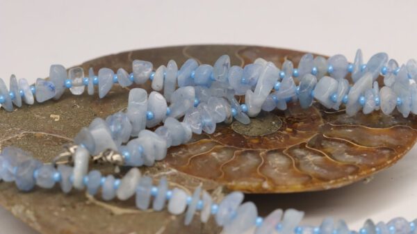 Kırık doğal taş akuamarin bileklik, genellikle gümüş veya beyaz altın gibi metallerle, güzel mücevherlere takıldığında eşleştirilir. Renk kombinasyonu birlikte iyi çalışır ve herhangi bir kıyafete özel, yazlık bir his katabilir. Bu güzel mavi değerli taşın büyüleyici renkleri soluktan derin mavilere kadar değişir ve genellikle okyanusla ilişkilendirilir.